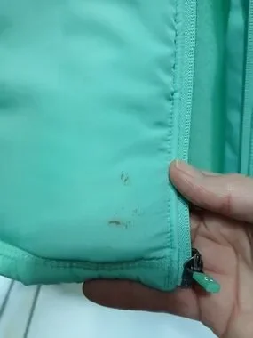 There are some stains as indicated in photos. And some wear. But it is still in good shape. It's a great jacket, especially for Spring and cool summer nights.