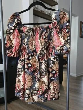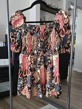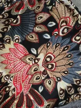 Black, red and cream feather mosaic patterned top. Top is super stretchy and shoulders can be pulled down or kept up.