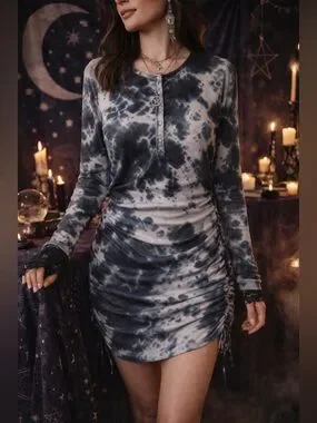 Fit: Stretchy best fits S/M depending on desired fit buttery soft ribbed thermal fabric (stretchy+substantial) flattering slimming ruched sides (adjustable length)henley snap button neckline long sleevebodycon silhouette that hugs in all the right places black gray tie dye wash (neutral+edgy) perfect for fall layering, festivals, everyday wear Free People style boutique aesthetic No brand tag