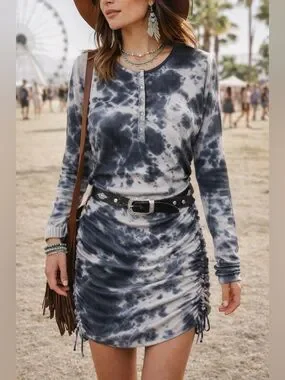 Tie Dye Henley Mini Dress Ruched Ribbed Thermal Top Bodycon Tunic Boho Festival