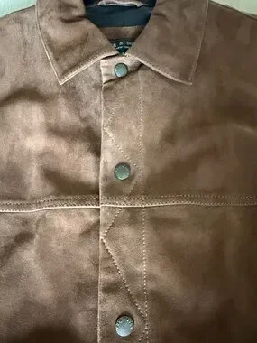 Gorgeous “Owen” trucker jacket from Rag & Bone in like new condition. Rich brown suede exterior. Snapped front closure and angled front pockets. Point collar and button cuffs. Clean, minimal design for versatile styling.