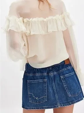 Casual denim mini with a subtle A-line shape. Elasticized waist for easy fit. Front seam and pocket detailing. Pairs well with tops and boots.