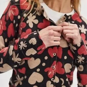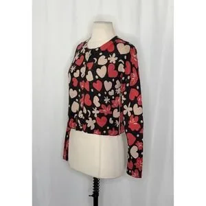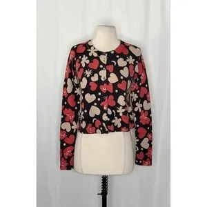 Rounded neckline ~ Long sleeves ~ Raised seams down the sides and undersides of the sleeves ~ Straight hemline ~ Cropped length or silhouette ~ Button closures all the way down the front ~ Soft unlined wool and cashmere knit blend ... ribbing at the neckline, sleeve cuffs and waistline ~ ~ Black with a floral, hearts and polka dot print in red and tan