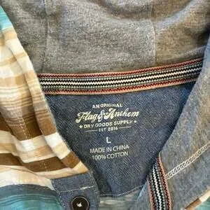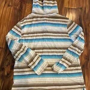 Flag & Anthem Men's Baja Striped Long Sleeve Henley Hoodie, Size Large. This lightweight pullover features a classic horizontal striped pattern in blue, brown, and cream tones. Made from soft 100% cotton, it includes a three-button henley neckline, an attached hood with grey lining, and a front kangaroo pocket. Perfect for coastal styling or a relaxed casual look. Excellent pre-owned condition with no visible holes or stains. Machine washable.