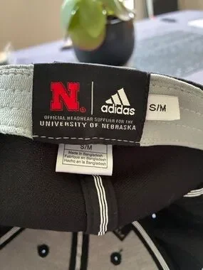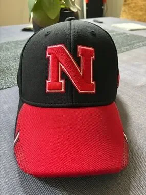 Nebraska Corn Huskers cap with bold embroidered 'N' on front. Red curved bill and matching red logo accents. Structured crown for a classic fit. Subtle textured pattern at bill edge.