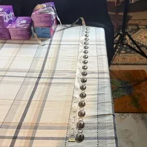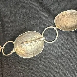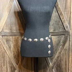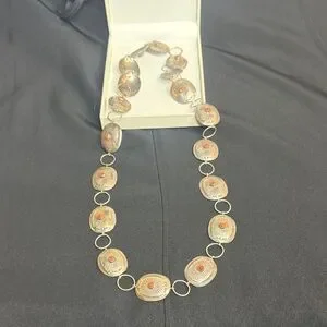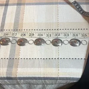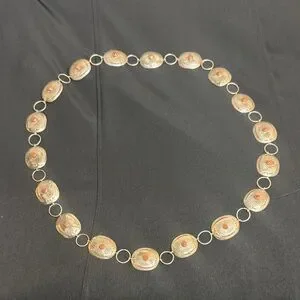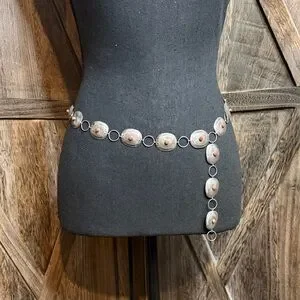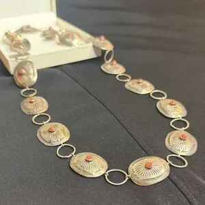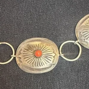 Eye-catching Vintage Sterling silver with coral stones concho belt. This belt is real sterling silver I have had it tested it's 100 percent sterling silver. vintage concho belt I bought in the southwest of Arizona Native American store while I was traveling. linked oval medallions. Each medallion features a small red coral center accent for a subtle pop of color. Lightweight design very delicate that layers well with other pieces. Perfect for adding a polished, Southwestern-inspired touch to everyday and dress looks. This is a super beautiful belt . And I also have worn it as a necklace. You can switch it up from a belt to a necklace to go with any outfit of your choice. The measurements are up in the pictures. The belt is 35 inch's in length. Very sturdy strong links so no worries about losing the belt.