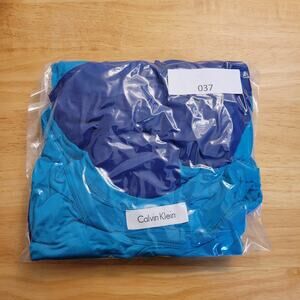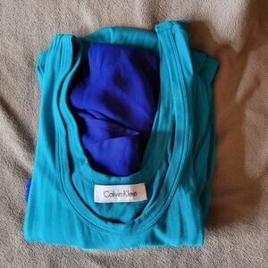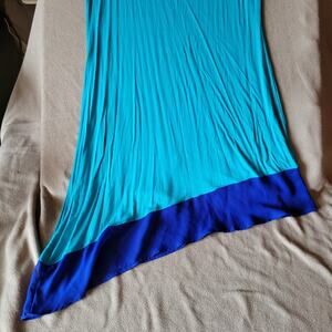Calvin Klein women’s asymmetrical dress in aqua and blue. Size Medium. Features a stylish asymmetrical hem, ruffle detail, and sleeveless design. Worn only once.