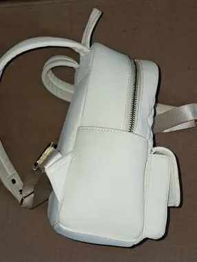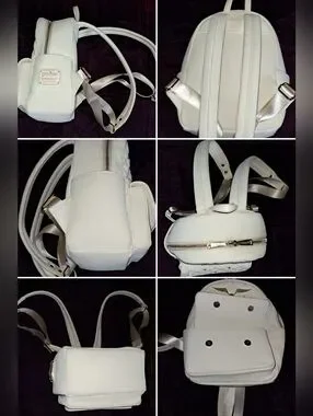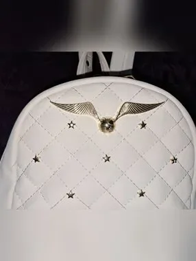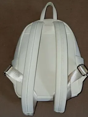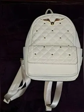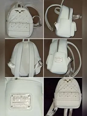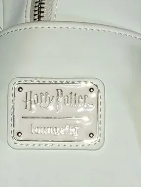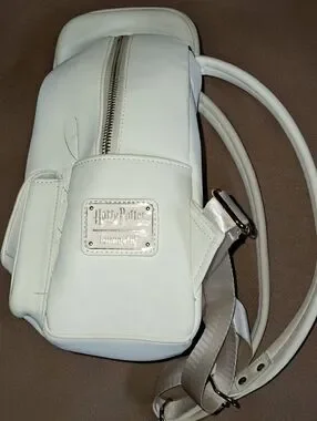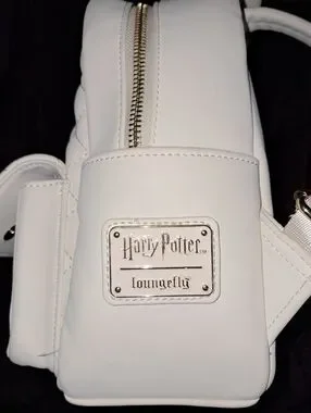 LOUNGEFLY HARRY POTTER BACKPACK. CREME with Goldtone hardware. Zip top. Side pouches. Inside zipper. Inside stains. See photos. Approximate flat measurements in inches: Base 6 3/4 x 3 3/4, depth 5 3/4 including front pocket, height 10, top loop 3, back strap 15, inside zipper 5 1/2, side pouches 1 3/4 x 4 1/4, front pouch with snap closure 6 1/2 x 3 3/4 x 1 1/4. Bundle and SAVE!! See closet for FREE with PURCHASE items.
