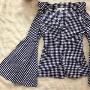 Off-the-shoulder style button-down shirt with wide, flared sleeves. 100% cotton. In good preowned condition.