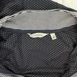Comfortable and stylish hooded half-zip pullover from Athleta featuring a classic navy and white striped pattern. This versatile athletic hoodie includes a half-zip neckline, adjustable hood drawstrings, and a relaxed athletic fit, making it perfect for both workouts and casual everyday wear. Inside pattern is navy and white polka dot. Sleeves have thumbholes.