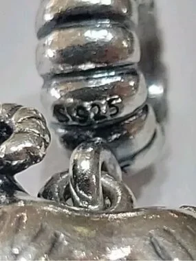 Pandora dangling ram charm with sculpted horns. Detailed body texture and polished surfaces. Bail designed for charm bracelets or necklaces. Classic zodiac-themed accessory.