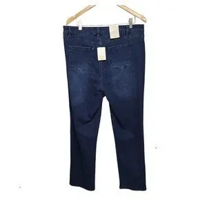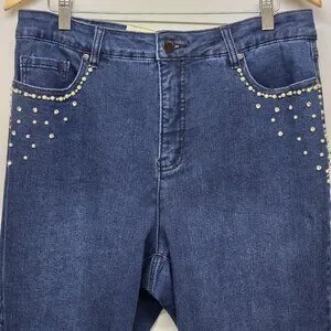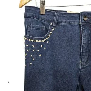 Classic straight leg jeans in dark blue wash. Features decorative silver-tone studs near the pocket for added style. Comfortable, versatile denim for everyday wear. Dress up or down with ease.