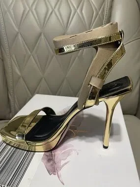 Shiny metallic gold finish for a glamorous look. Open toe with single front strap. Ankle strap with buckle closure. High platform and sculpted block heel. Padded footbed for added comfort.