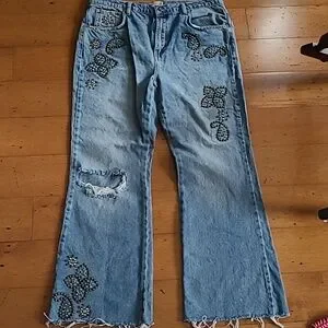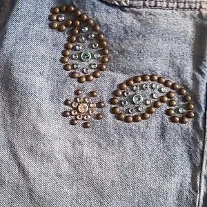 Light blue denim with rhinestone and studded floral and paisley embellishments. Distressed knee and frayed hems. Boho-chic detailing.
