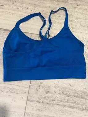 New Balance women’s sports bra in size Medium. Vibrant blue color with a racerback design, perfect for workouts, gym sessions, or everyday athleisure wear.