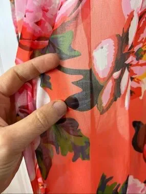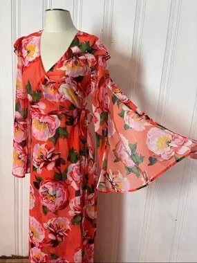 The vibrant coral base with oversized floral print makes this piece incredibly eye-catching, while the flowy silhouette adds drama and elegance with every step.