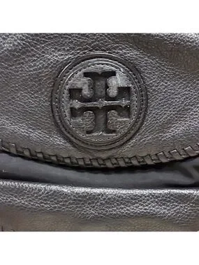 Design: A distinctive whipstitched leather flap featuring the iconic embossed Tory Burch logo. It includes a main compartment with drawstring closures and additional front pockets with buckle accents. Durable nylon body paired with textured leather flaps and gold-tone hardware.