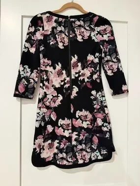 Sleek black dress with an all-over floral pattern. Soft pink and cream blooms create a feminine look. Three-quarter sleeves add a polished touch. Easy, versatile style for many occasions.