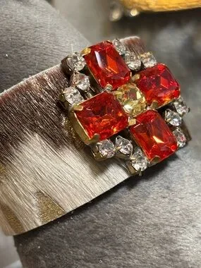 Bold red crystal stones set in a sparkling cluster create an eye-catching centerpiece. Gold-tone accents add warm contrast. Designed for standout style and easy wear. Perfect for elevating evening and casual looks in red.