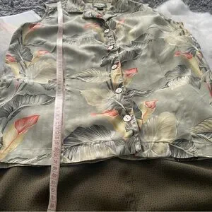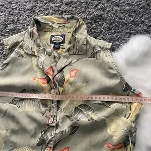 Stylish sleeveless silk blouse with a floral pattern. Features a button-up front and a tropical design.