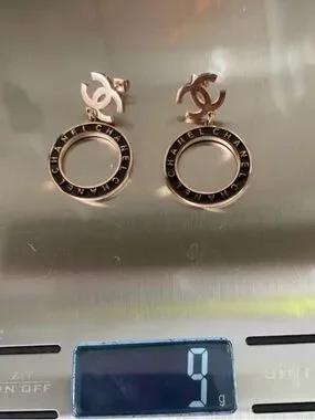 Elegant drop earrings with interlocking logo studs. Black enamel rings edged in gold. Circular logo detail adds bold style.