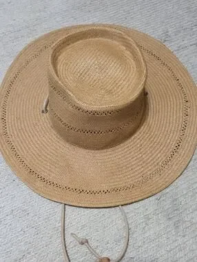 Natural straw boater hat with a wide brim for sun protection. Lightweight woven construction with ventilated detailing for breathability. Neutral natural color pairs easily with summer outfits.