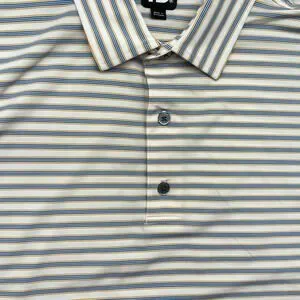 FootJoy performance golf polo features a classic multi-color striped pattern in blue, gold, and white. Designed with a three-button placket and a crisp collar, this short-sleeve shirt includes the signature FJ logo embroidered on the back neck and a "1909" golf club graphic on the left sleeve. The lightweight, breathable fabric and side-slit hem offer comfort and mobility for on or off the course.