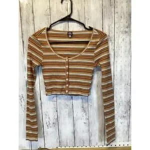 BDG Striped Ribbed Crop Top Y2K Long Sleeve Henley Brown Womens M