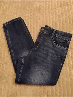Slim skinny fit. Dark blue wash with subtle fading. Classic five-pocket style. Stretch denim for comfort.