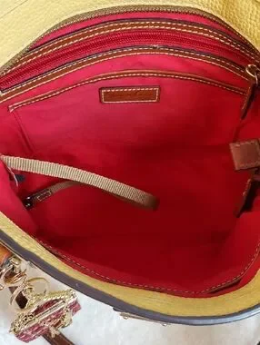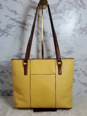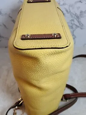 Dooney & Bourke Lexington pebbled leather tote in bright yellow with brown leather straps and trim. Zip top with roomy interior. Gold-tone hardware and a decorative bag charm included. Classic silhouette for daily use. Sold as is!