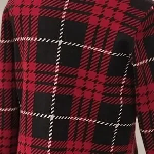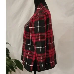 Anne Klein knit sweater features a bold red and black plaid pattern with white windowpane accents. Designed with a sophisticated mock neck and 3/4 length sleeves, this top offers a structured yet comfortable silhouette with side slits at the hem for ease of movement. The mid-weight knit fabric makes it a versatile piece for seasonal layering or professional wear.