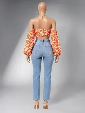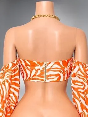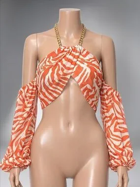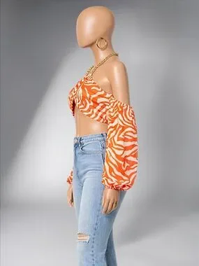 Turn heads in this bold and flirty statement top featuring a vibrant orange animal print and luxe gold chain halter neckline. Designed with off-the-shoulder long bellow sleeves, a chic cropped silhouette, and a flattering cross-front underbust detail, this top is perfect for nights out, parties, vacations, or special occasions.