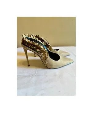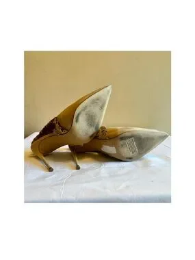 Very gently used! Excellent quality. Solid light tan color. Closed, pointed toe. Back strap has gorgeous ruffle detail. Heel is stiletto. Faux suede. Some slight imperfections; see last 2 pics for wear. Great for work and events!! Heel @ 4.5”.