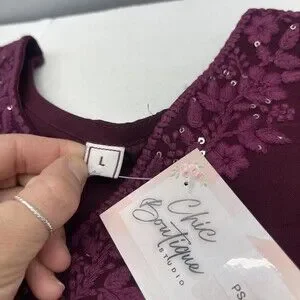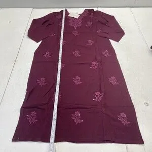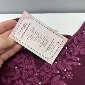 New Chic Boutique Studio womens kurta and pants set with original paper hang tag attached at the neckline. Deep purple woven fabric, floral embroidery, sequins, elastic waistband, and lace trim are clean and intact with no wear, stains, or damage; fabric shows wrinkling from storage and a few tiny loose threads at some hems. Any rulers or measuring tools shown in photos are for size reference only and are not included, and no additional retail packaging is included.