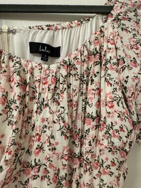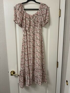 Lightweight cream dress with a delicate pink and green floral print. Features a square neckline and puff sleeves for a feminine silhouette. Flowy midi skirt with a soft ruffle hem for easy movement. Perfect for everyday wear or a casual daytime event.