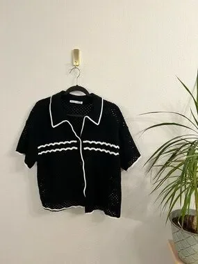 Abercrombie Knit Polo Cardigan XL Black White Cropped Open Knit