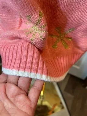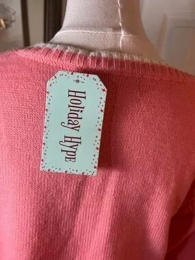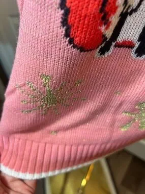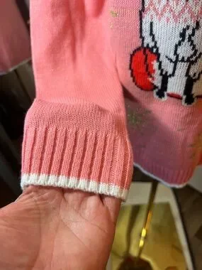 Soft pink crewneck sweater featuring a playful red fox graphic and a small gold pom accent at the hat. Comfortable long sleeves and a relaxed fit for everyday wear. Subtle gold snowflake details add seasonal sparkle. Easy to style for casual winter outfits.