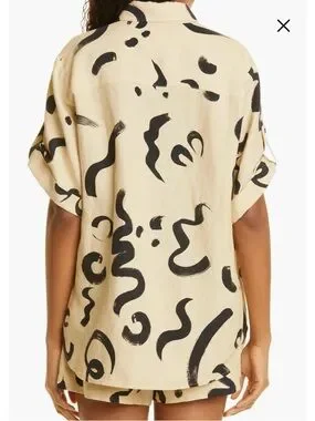 Relaxed short-sleeve button-down by Alemais. Beige base with bold black abstract brushstroke motifs. Classic collar and easy, casual silhouette. Striking print for modern everyday wear.