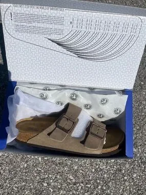 Classic Birkenstock Arizona with two adjustable suede straps. Contoured cork-latex footbed offers support. Durable rubber sole for traction. Neutral taupe brown pairs with casual looks.