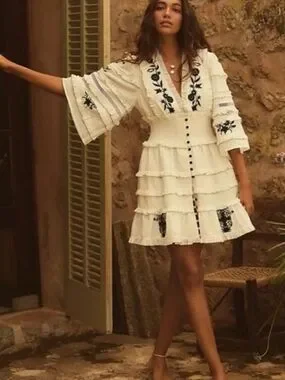 Anthropologie Mini Dress Embroidered Ruffled Vacay Preppy Boho