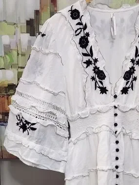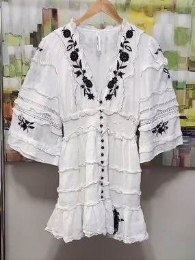 Anthropologie mini dress embroidered ruffled vacation preppy boho