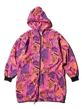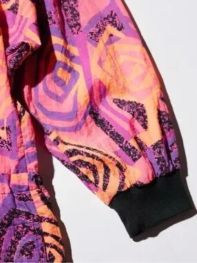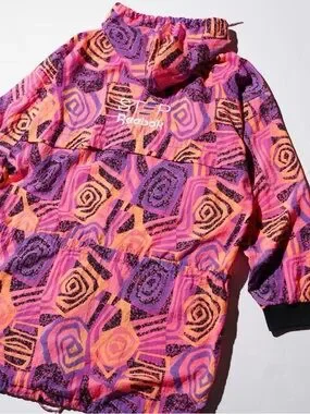 Reebok windbreaker with bold geometric print. Bright pink, orange, and purple panels. Black printed accents throughout. Lightweight sporty layer with zip front.