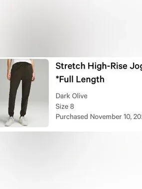 Stretch high rise jogger (full length). Dark olive color. tapered joggers with elastic cuffs. Adjustable drawstring waist for a secure fit. Side pockets for everyday carry. Lightweight, stretchy fabric for easy movement.