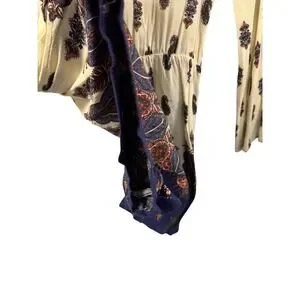 Keywords: paisley print, lace up, tassels, smocked waist, crochet trim, boho, festival, vacation, casual, long sleeve, one piece, summer, spring