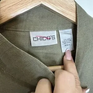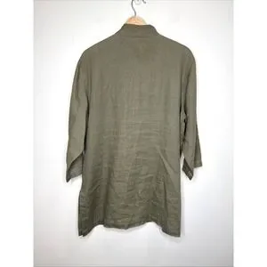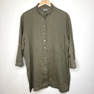 Chicos 100% Linen Button Up Tunic Top L Green Band Collar Sustainable Lagenlook