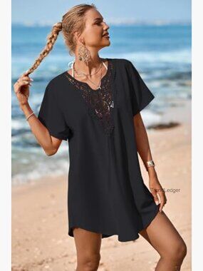 Lace Crochet V-Neck Cover Up Dress, Rayon, Loose Fit, Beach Swimsuit Cover