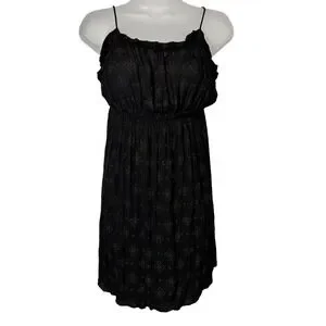 A black mini dress with a gold geometric pattern. This charming dress features delicate spaghetti straps, a ruffled neckline, and a smocked empire waist for a flattering silhouette. The flowy skirt adds a touch of ease and movement, perfect for warm weather. Ideal for casual outings, beach vacations, or summer festivals.