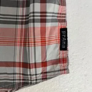 Keywords: Prana shirt, mens plaid, short sleeve button up, casual shirt, outdoor, travel, everyday wear, comfortable, breathable, button chest pockets, red grey, outdoor apparel, activewear