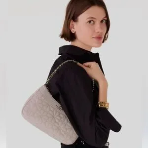 Sleek shoulder bag with a single top handle which can revert to a wristlet Quilted floral-inspired pattern on the front. Gold-tone logo plaque. Minimal, feminine silhouette for day or night.
