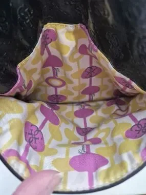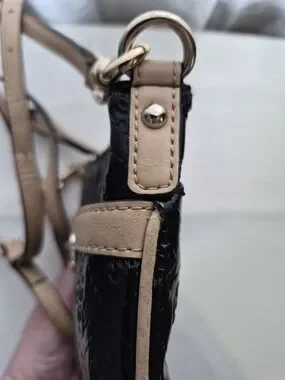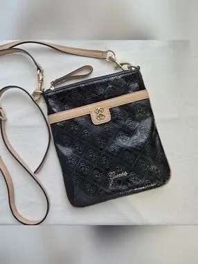 Guess Reiko black patent crossbody with debossed monogram pattern has beige trim and adjustable strap. Also features goldtone hardware, top zip closure, and front pocket. Measures 7.5" x 8.5". Excellent used condition. Only callout is minor scuffing on one corner trim. Please see all photos.